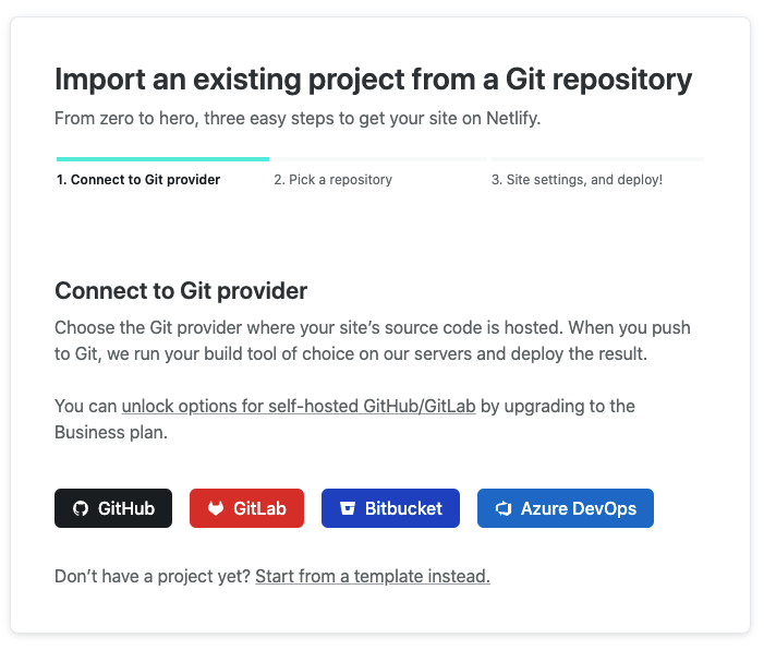 2. If you are using GitHub, GitLab, Bitbucket, or Azure DevOps, you can point Netlify at your site’s source code and have it deployed whenever your code changes.